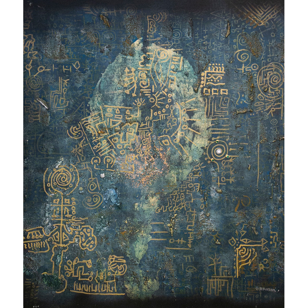 Medium: Mixed media on canvas with set diamonds, including a 0.30 ct D color round brilliant natural diamond and three emerald-cut emeralds totaling 0.20 ct